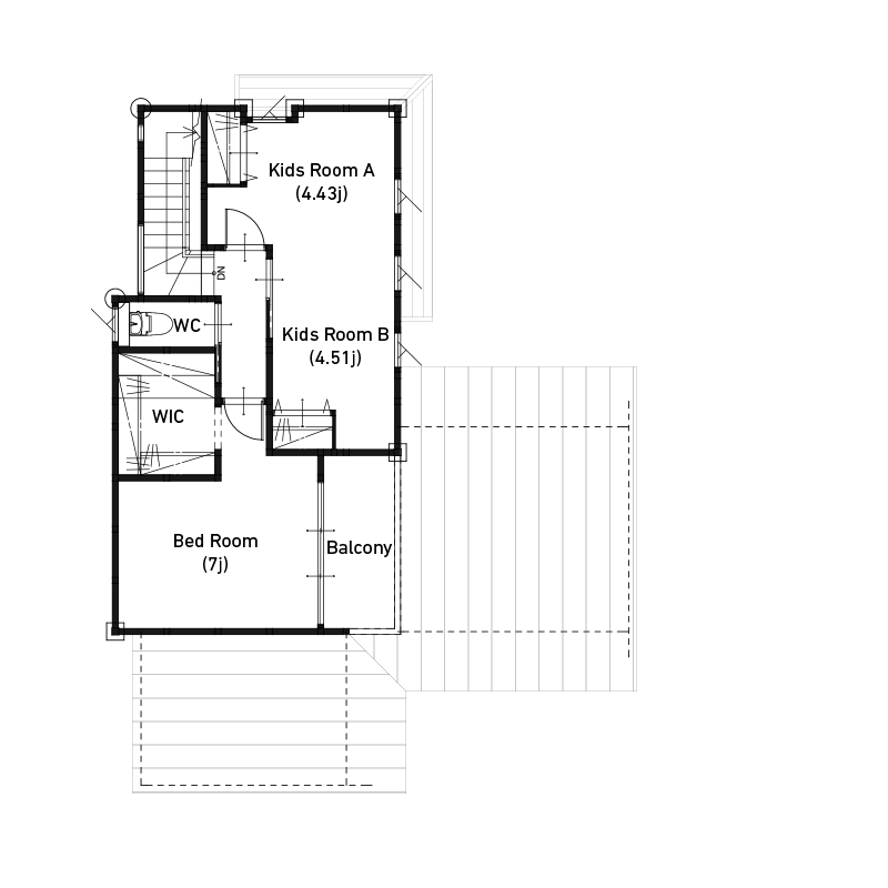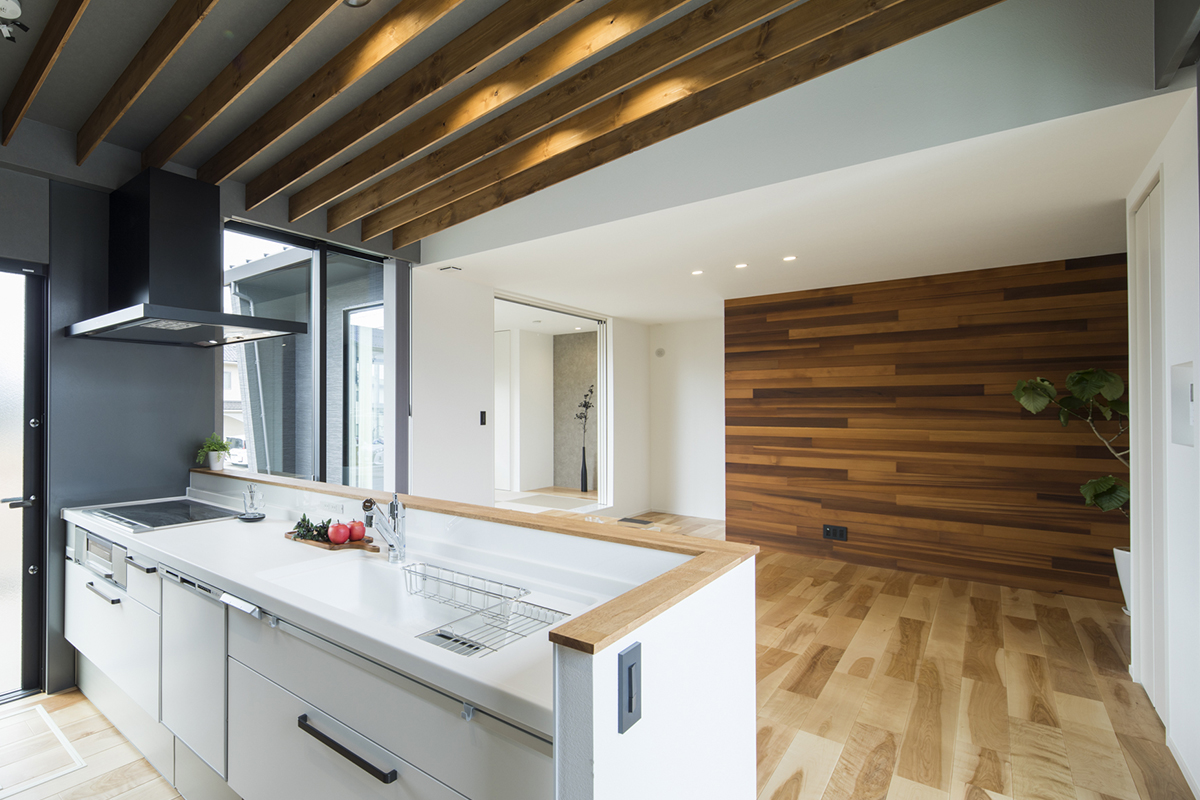 自然のままに枝を広げる株立ちの樹木が、無機質でクールな建物に、穏やかな温もりを添える。木目の濃淡を生かしたランダムマッチの壁は、表情豊かなインテリアとして空間を彩っている。リビングと玄関をガラスで仕切ることにより、視覚的なつながりを残しながら、空間の広がりを演出している。